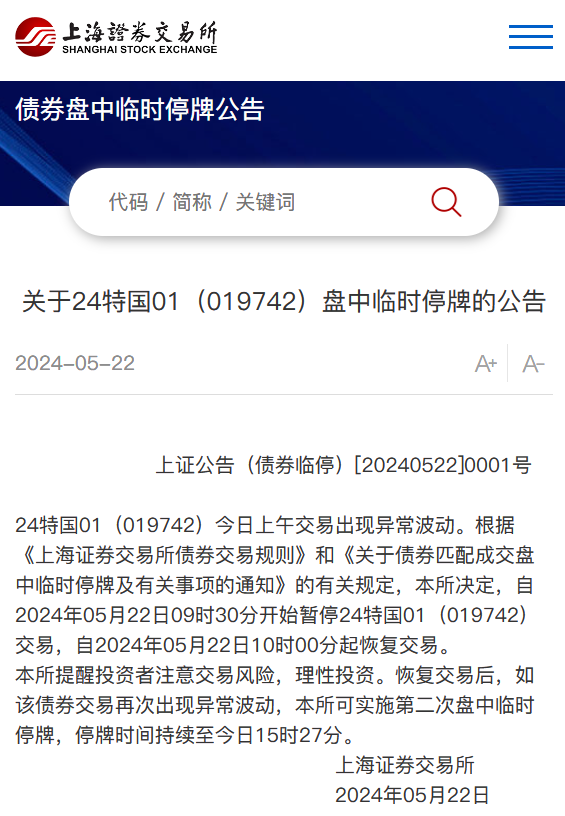 上交所:24特国01(019742)今日上午交易出现异常波动。本所决定,自05月22日09时30分开始暂停24特国01交易,自22日10时00分起恢复交易。