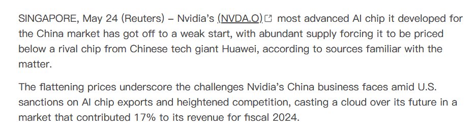 据路透社消息,英伟达对华专供的AI芯片销售疲软,在售最强的H20芯片供应充足。消息人士透露,目前存在H20芯片在华为昇腾(Ascend)910B芯片售价基础上再折价10%出售的情况。