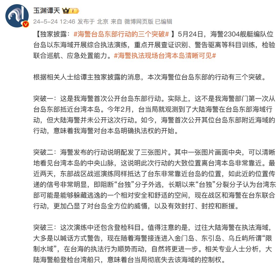央视旗下媒体称,本次海警行动取得三个突破:海警首次公开台岛东部行动、非常靠近台岛、演练包含登检科目。
