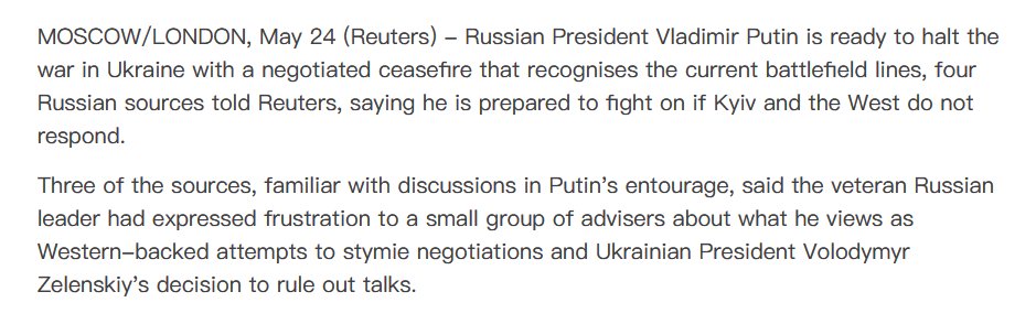 消息人士称,普京准备通过停火谈判来停止乌克兰战争并确认目前的战线,并表示若乌克兰与西方不作出回应,会准备继续作战。 https://t.co/8opDKISXCw