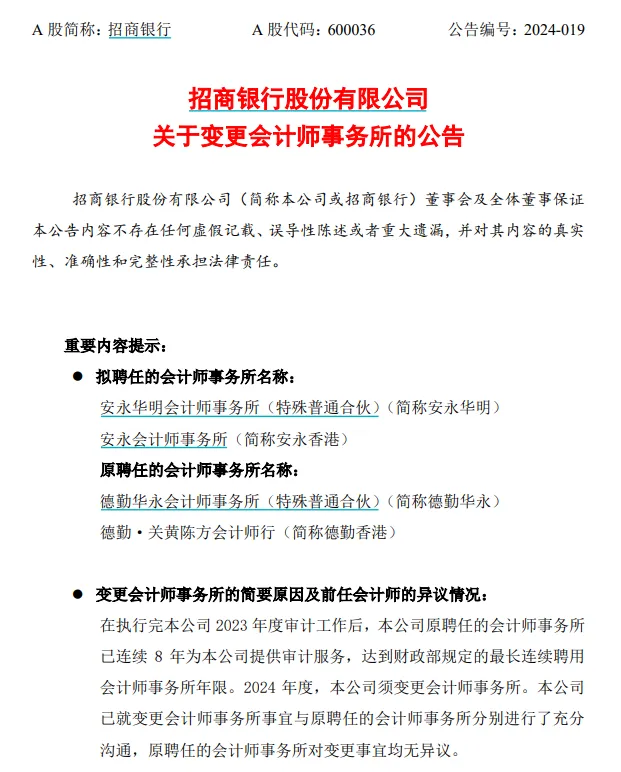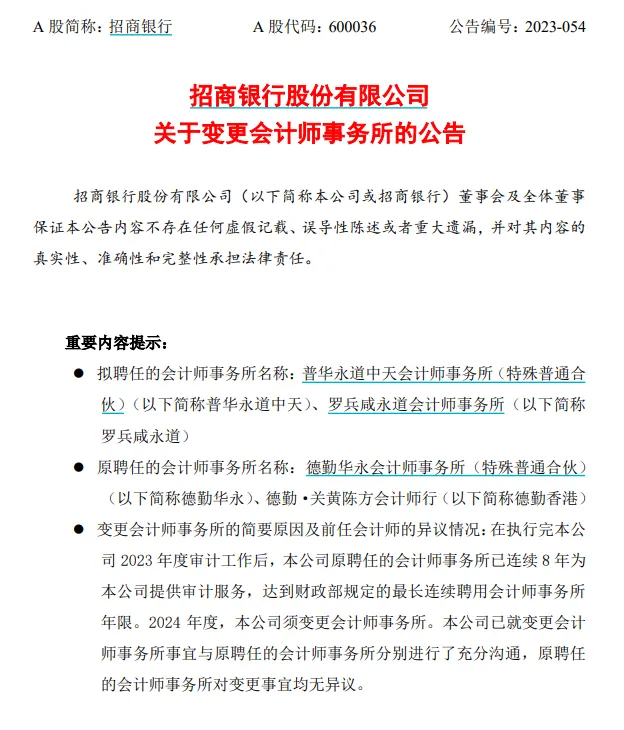 招商银行变更聘任会计师事务所,从原计划聘任普华永道改为安永。近期也有知名上市企业取消与普华永道的合作,包括中国中铁、青岛港,粤电力A,迈瑞医疗,沪硅产业等。