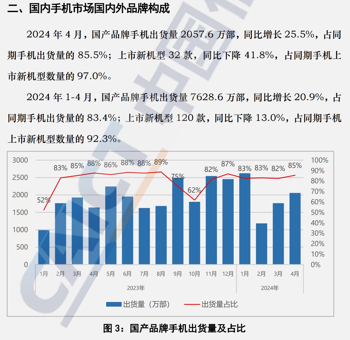 #刚刚 中国信通院公布4月国内手机市场运行数据。其中国产品牌手机出货量2057.6万部,同比增长25.5%;国外品牌手机出货量约为349万部,较去年同期约230万部增长51.7%。