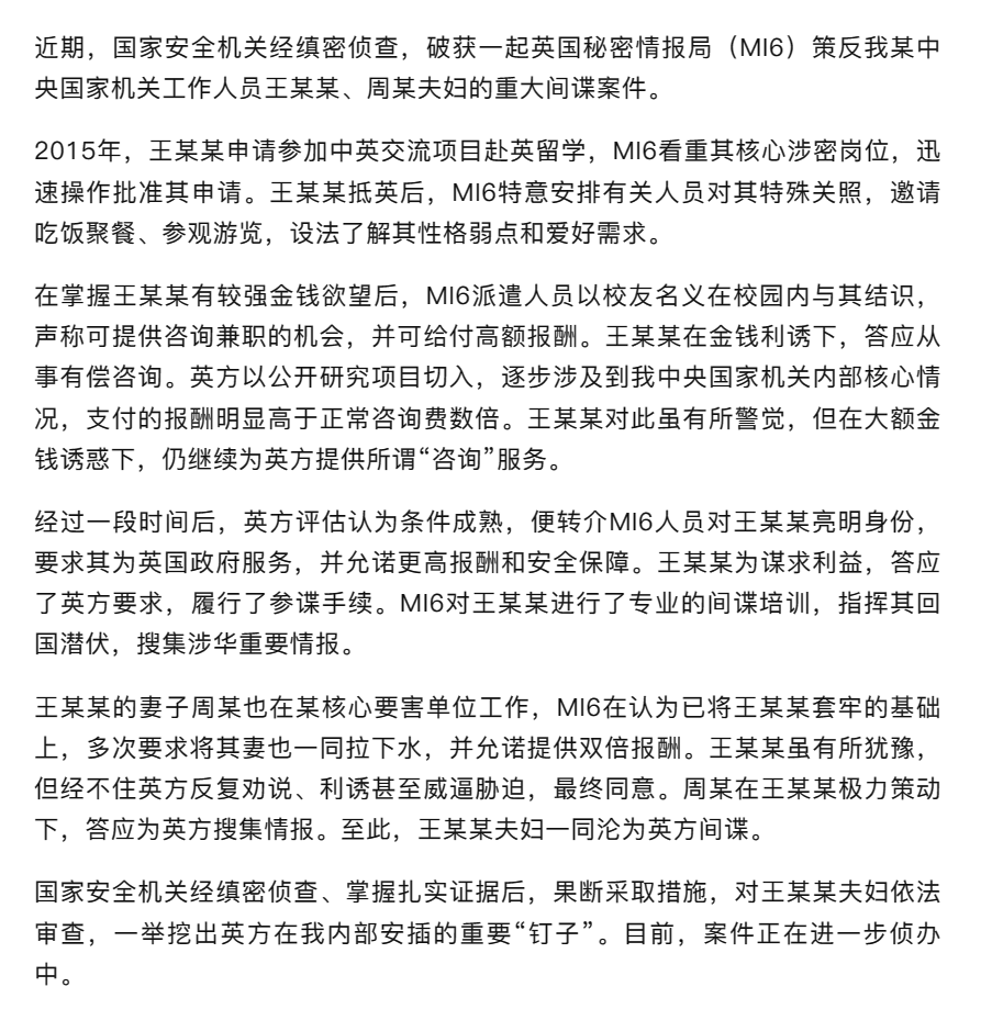 英国秘密情报局(MI6)对王某某进行了专业的间谍培训,指挥其回国潜伏,搜集涉华重要情报。周某在王某某极力策动下,答应为英方搜集情报。夫妇二人一同沦为英方间谍。 https://t.co/dfQ6LmAd6o