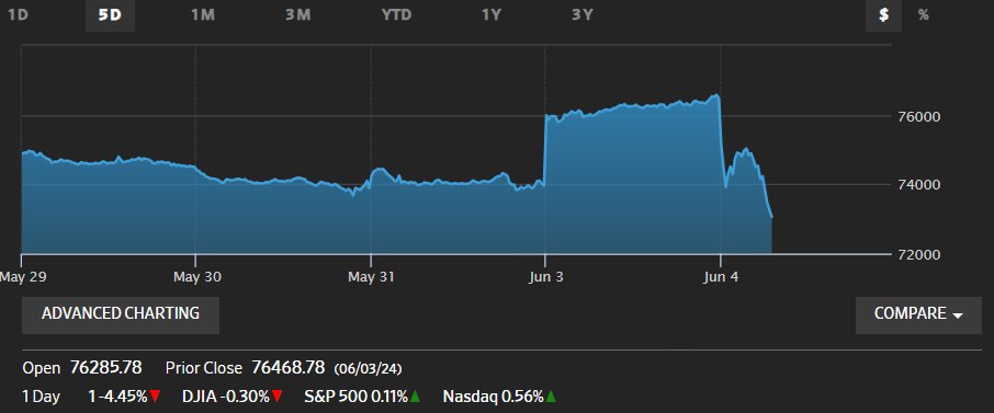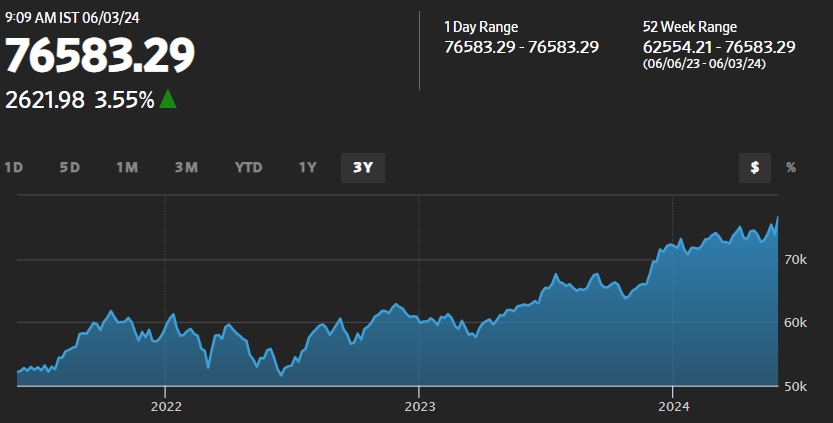 印度SENSEX指数上涨3.55%至76583.29点,创历史新高。印度NIFTY指数在盘前交易中上涨3.6%。 https://t.co/Epn98wnjVp