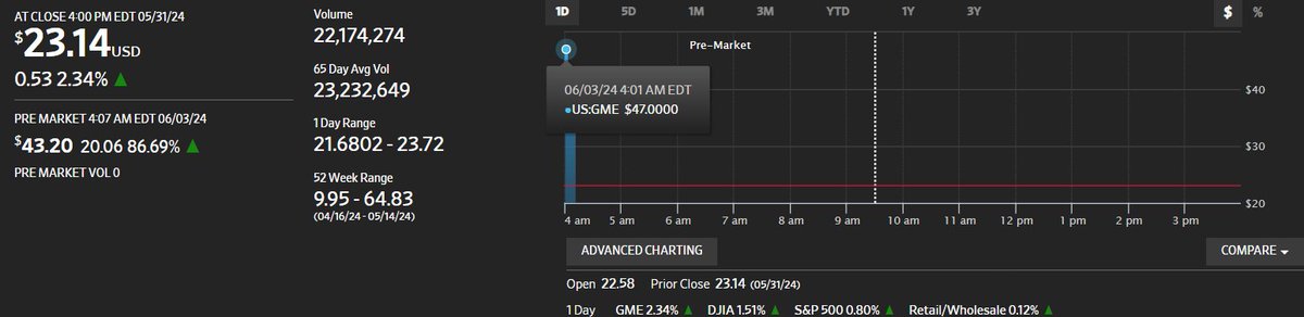 #行情 GameStop $GME 股价盘前一度较周五收盘拉升100%。另一只Meme股AMC院线盘前涨30%。 https://t.co/0HewMhtWsU