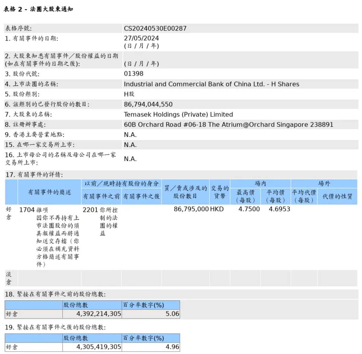港交所披露易信息显示,淡马锡控股在5月27日出售8679.5万股工商银行H股股份,套现约4.08亿港元。减持后,淡马锡持股数量降至43.05亿股,占比降至5%以内。
