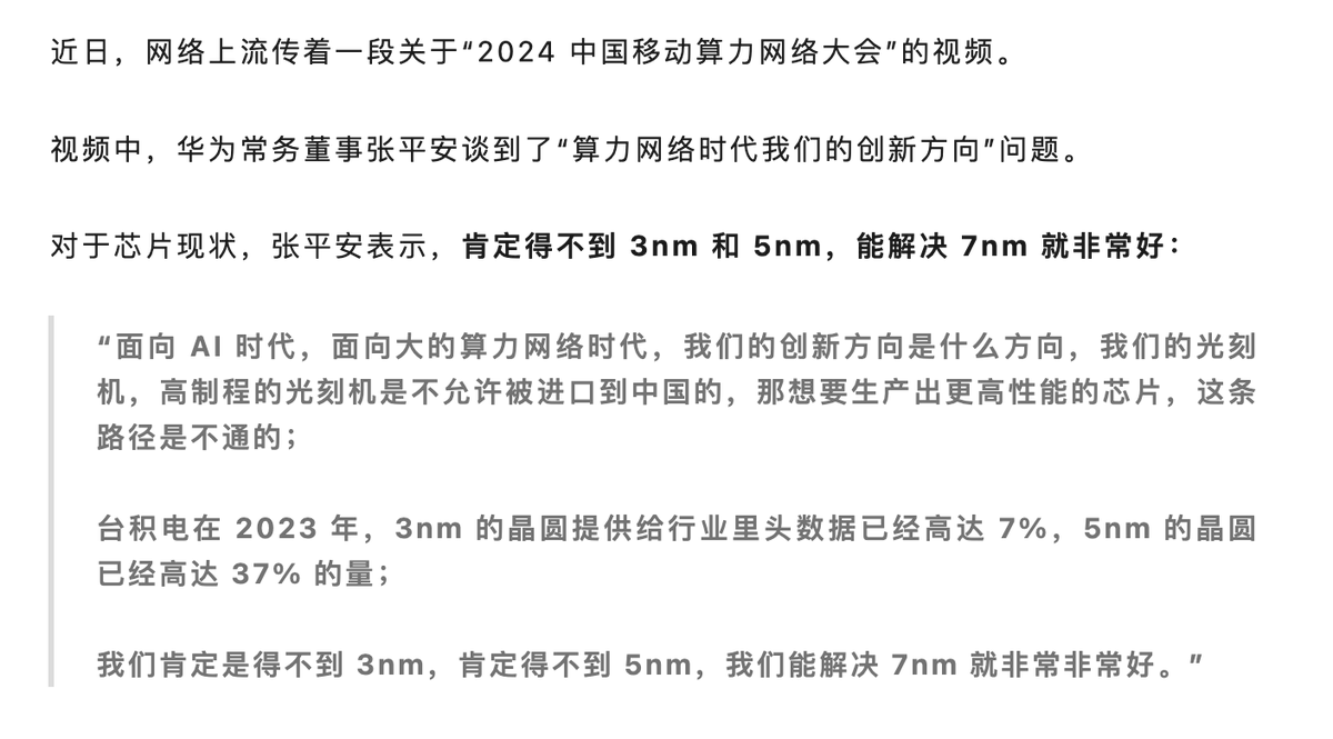 华为常务董事张平安:3/5nm肯定得不到,能解决7nm就非常好。希望要用空间、用带宽、用能源来换取我们在芯片上的缺陷,避开芯片上的限制。 https://t.co/KJqIG2Vmj5