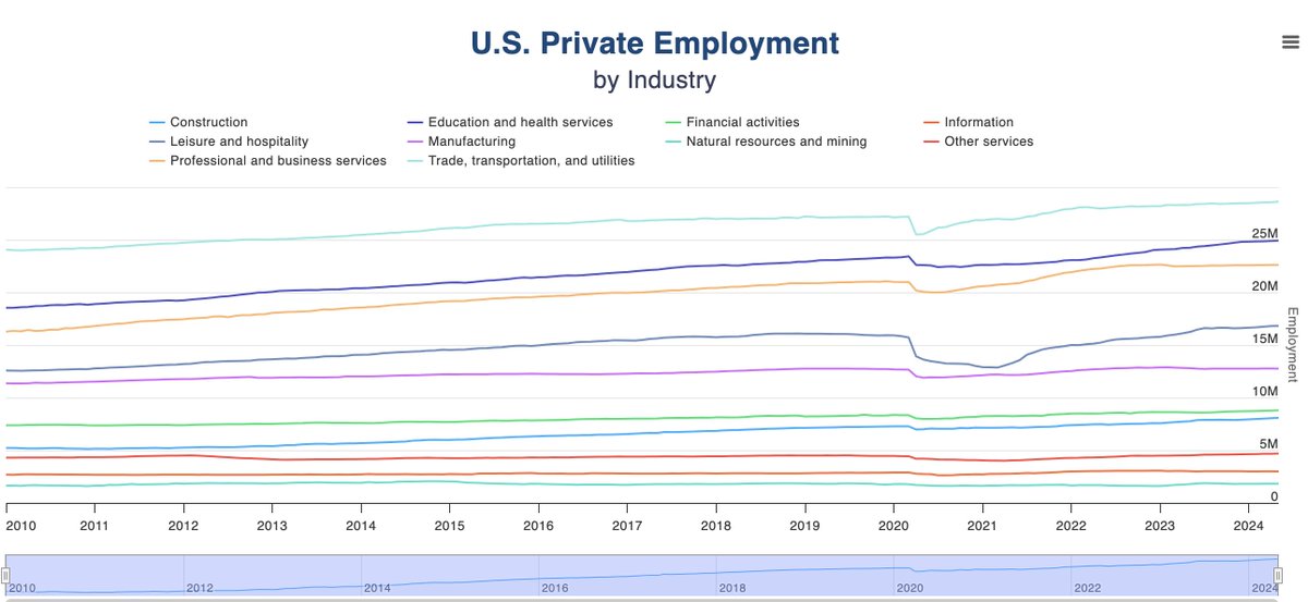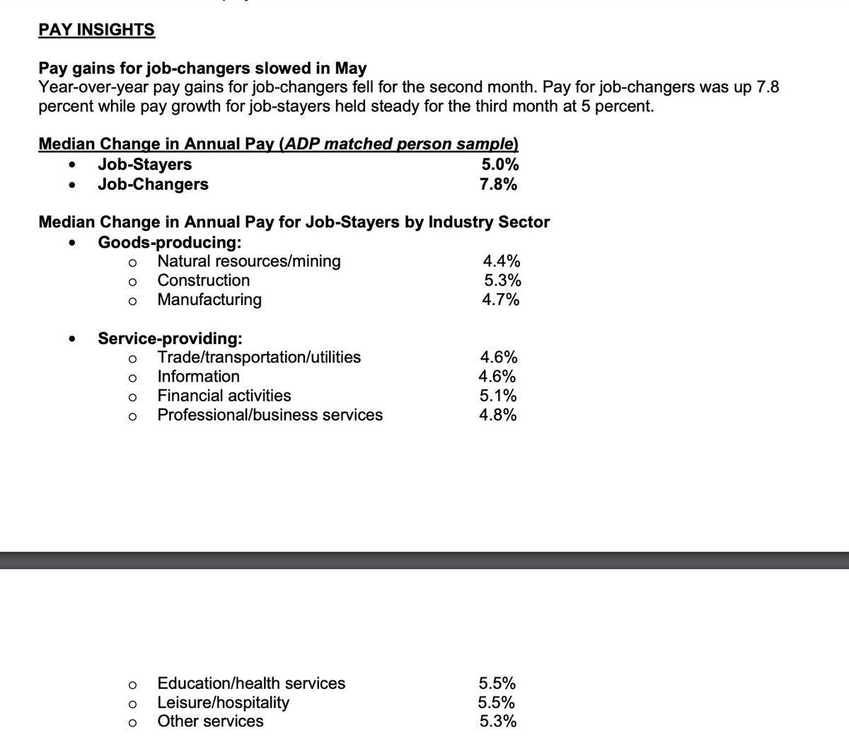 从报告中可以看到跳槽者的薪资增长7.8%,涨幅连续两个月下降,而维持原岗位的就业人员薪资连续第三个月维持5%的增幅。ADP首席经济学家认为目前劳动力市场稳固,预计下半年就业增长和薪资增长放缓,正在监测与生产者和消费者相关的明显疲软的问题。