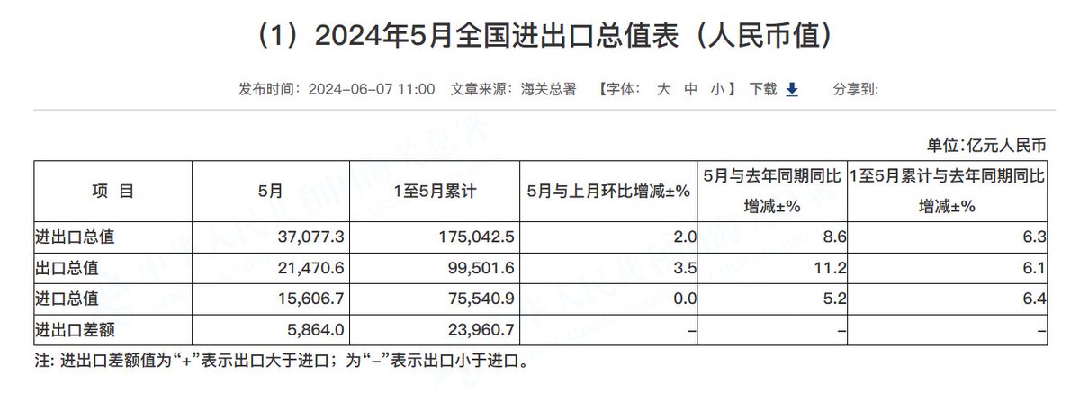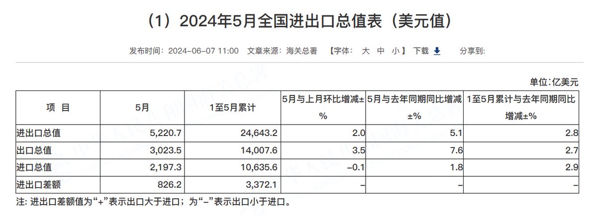 以美元计价进出口总值5220亿美元,增长5.1%。其中,出口3023亿美元,增长7.6%;进口2197亿美元,增长1.8%;贸易顺差826.2亿美元。 https://t.co/9lQRD3W6ir