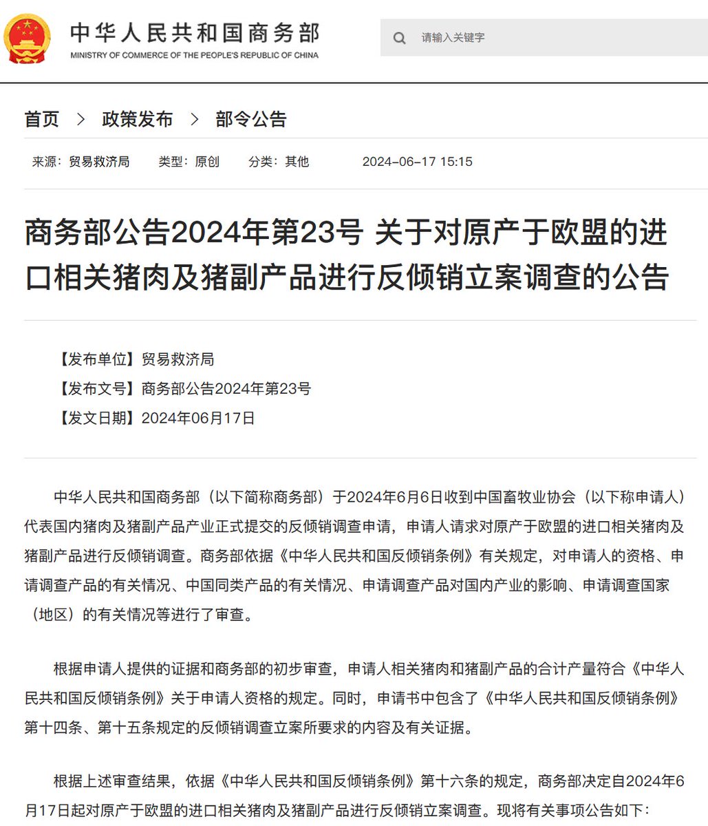 #突发 商务部决定自2024年6月17日起对原产于欧盟的进口相关猪肉及猪副产品进行反倾销立案调查。