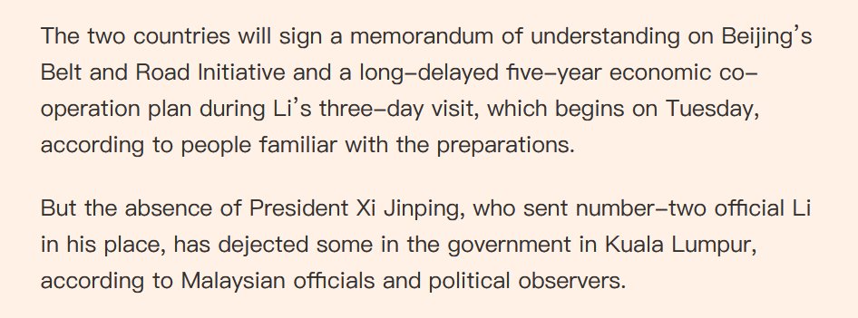 据英国金融时报(FT)援引消息人士报道,随着李强周二开启对马来西亚的访问,中马两国将签署一带一路谅解备忘录以及新一轮经贸合作五年规划。但有马来西亚官员与政治观察家称,对习近平未在两国建交50周年之际访马,而将日程推迟至2025年感到失望。