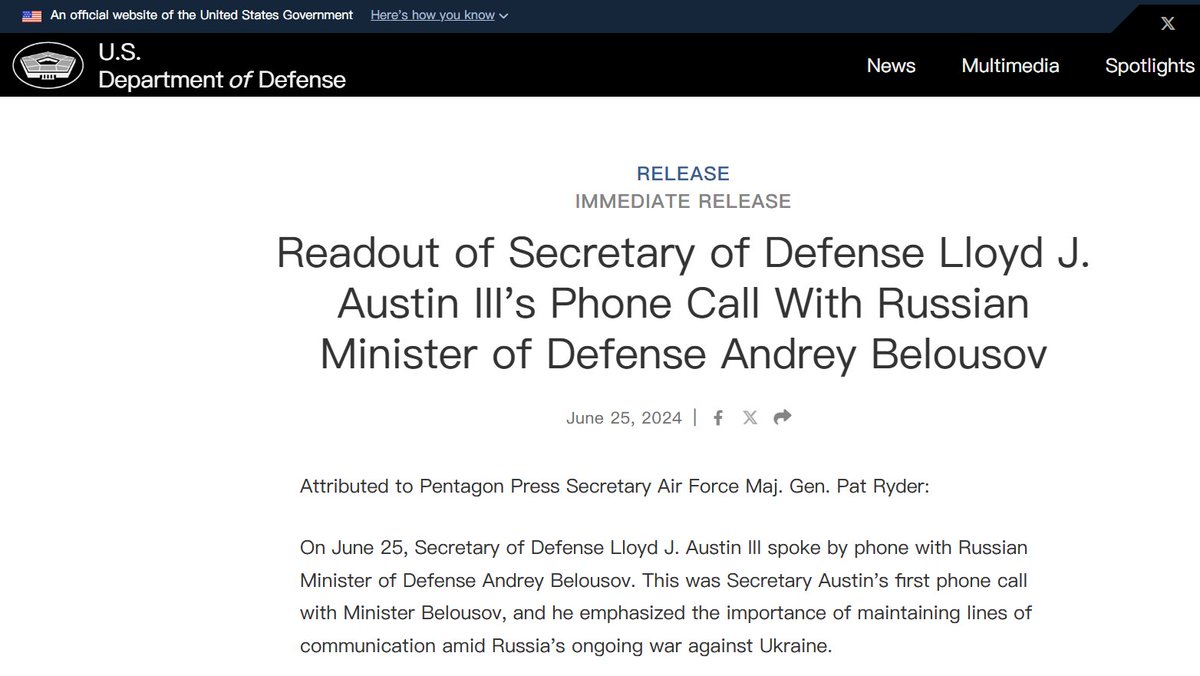 美国国防部部长奥斯汀与俄罗斯新任防长通电话,为俄乌冲突爆发后两国防长罕见直接沟通。奥斯汀强调了保持沟通渠道的重要性。