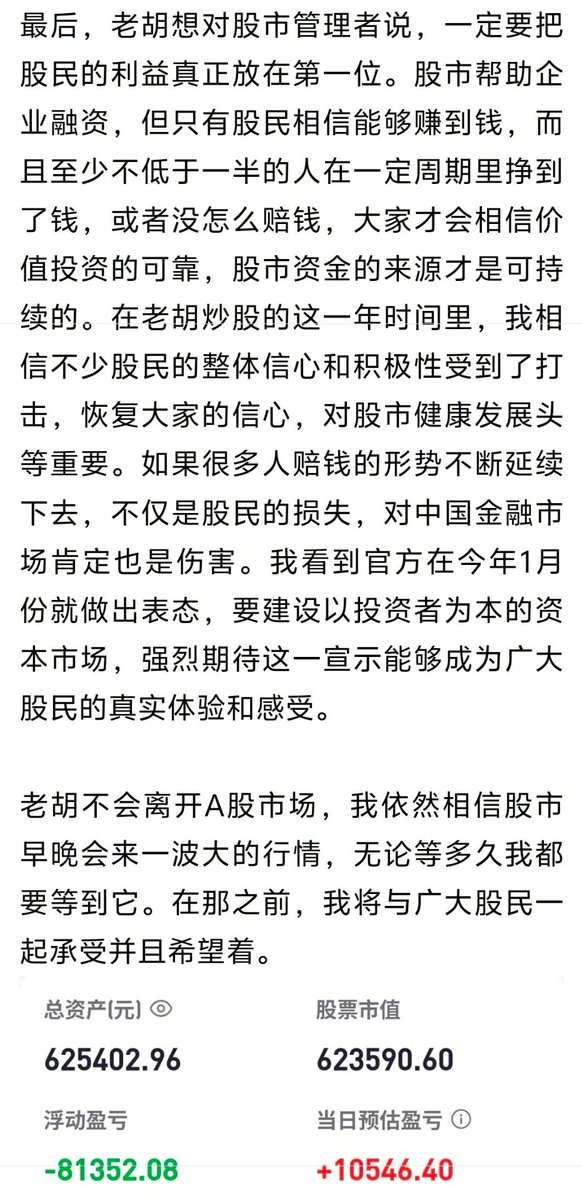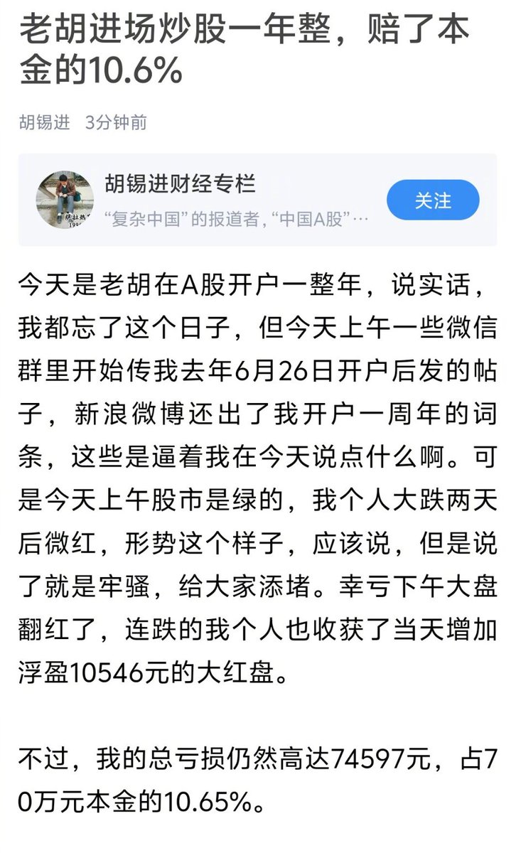 胡锡进A股开户一周年,总亏损74597元,占70万元本金10.65%,呼吁股市管理者要把股民利益真正放在第一位。 https://t.co/ThEqlbZMku