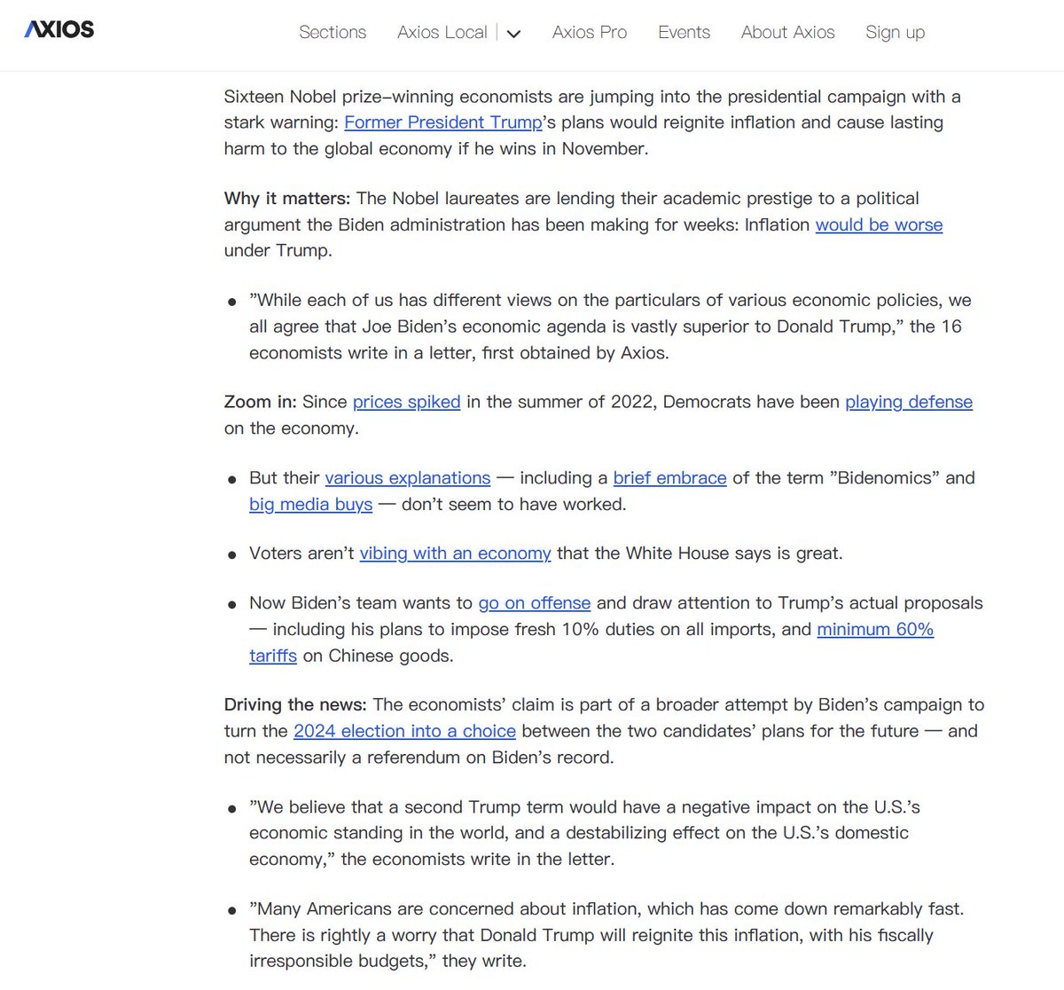 据Axios报道,16位诺贝尔经济学奖得主联名签署了一封信,信中警告称若特朗普赢得总统大选,特朗普的经济将重新引发通货膨胀,并对全球经济造成持久损害,而拜登的经济议程“远远优于”特朗普。