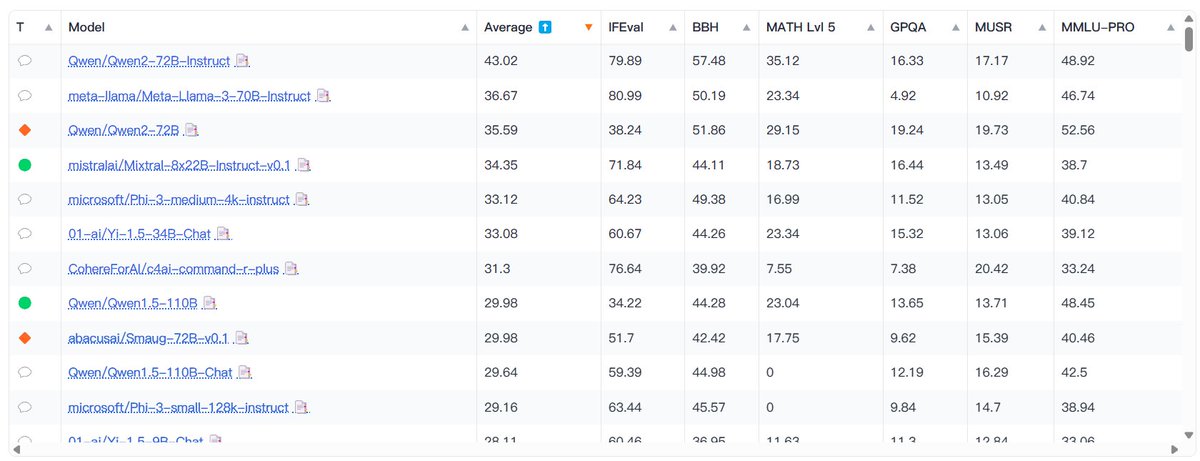 开源平台huggingface CEO Clem宣布,阿里最新开源的Qwen2-72B指令微调版本成为开源模型排行榜第一名,称中国在全球开源大模型领域处于领导地位。 https://t.co/1rFO0Gzzbs