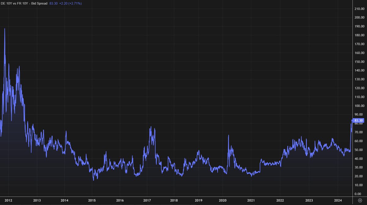 法国德国十年期国债收益率利差拉开至83.3个基点,为2012年以来最阔。
