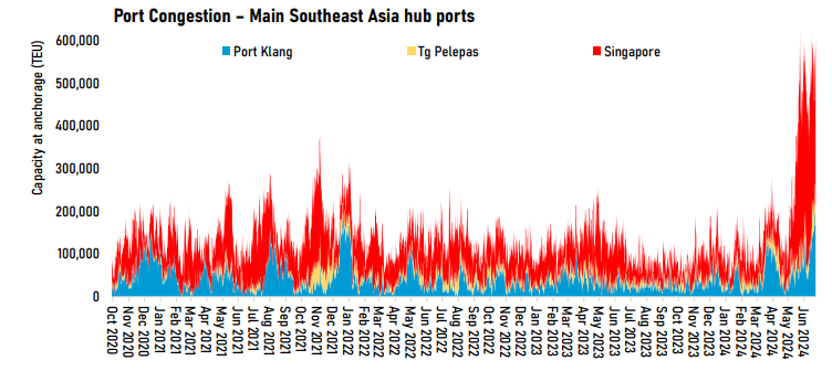另据Linerlytica的数据,6月全球港口拥堵程度已达到18个月以来的最高水平,60%的船舶停靠在亚洲港口。截至6月中旬,总运力超过240万个TEU(20英尺标准集装箱单位)的船舶正在等候。