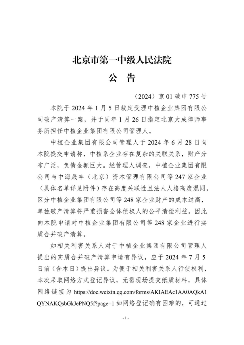 中植集团与中海晟丰(北京)资本管理有限公司等247家企业存在高度关联性且法人人格高度混同,区分企业财产成本过高,单独破产清算将严重损害全体债权人的公平清偿利益。因此,管理人申请对 #中植 集团等248家企业进行实质合并破产清算。