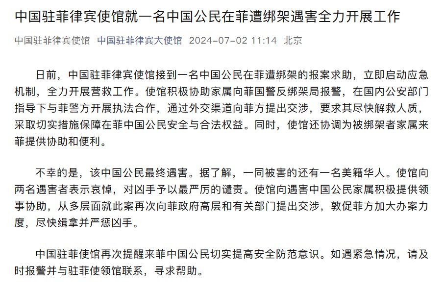 中国驻菲律宾大使馆:日前使馆接到一名中国公民在菲遭绑架的报案求助,立即全力营救。该中国公民最终遇害,一同被害的还有一名美籍华人。敦促菲方尽快缉拿并严惩凶手。 https://t.co/iSNSq3I2Y3
