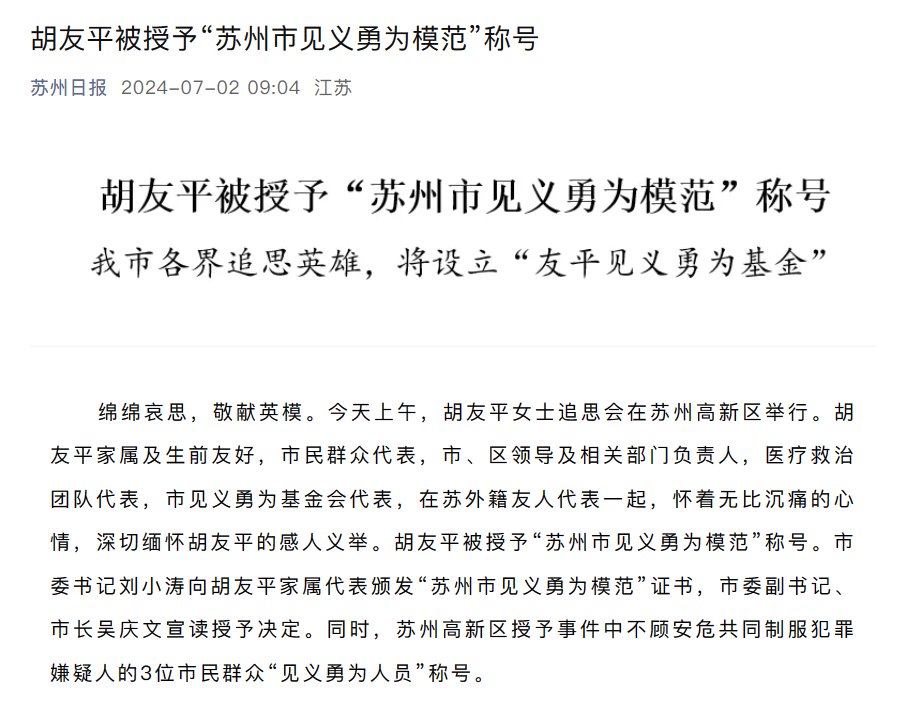 苏州日报:胡友平被授予“苏州市见义勇为模范”称号。胡友平直面生死,阻止恶行,扶弱救危,以平凡之躯行英雄之举,保护了同胞和外国友人的生命安全,为弘扬社会正气树立了标杆。 https://t.co/sFITBUscZN