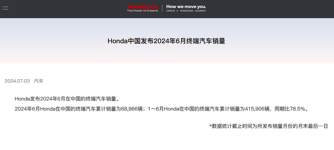 #数据 本田中国6月终端汽车销量68966辆,较去年同期减少四成。1至6月累计销量415906辆,同比跌两成。 https://t.co/Sk9I0Xeubx
