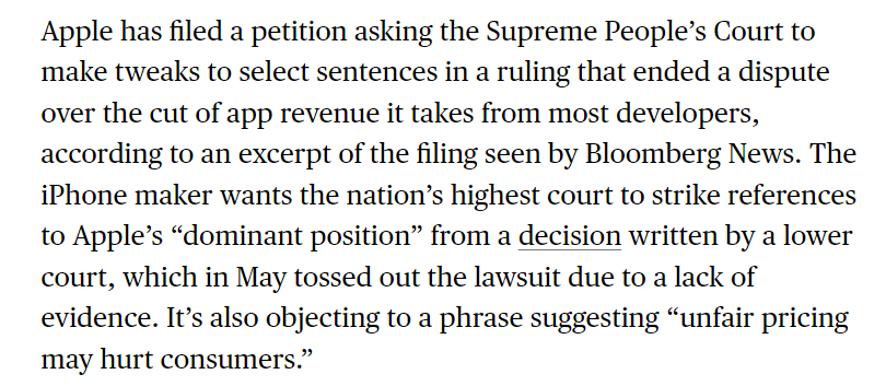 彭博社:苹果希望中国法院在裁决书中去掉“支配地位”的表述