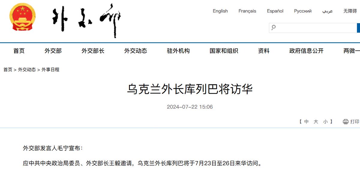 #新闻 应王毅邀请,乌克兰外长库列巴将于7月23日至26日访问中国。 https://t.co/4Mel3IsCcX