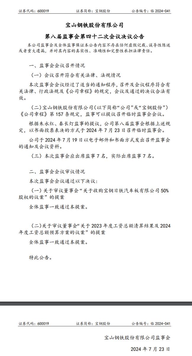 #后续 宝钢股份:全体监事一致通过董事会“关于收购宝钢日铁汽车板有限公司50%股权的议案”。 https://t.co/vy9XAF8Q3E
