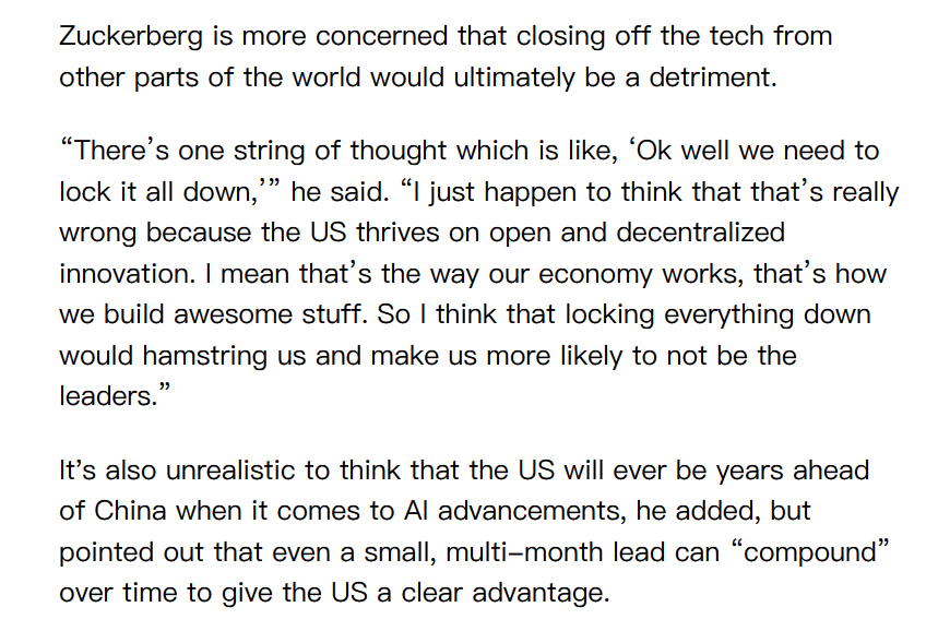 扎克伯格认为,美国在人工智能发展方面永远领先中国数年是不现实的。但他也指出,即使是几个月的微小领先也会随着时间的推移而“积少成多”,从而使美国获得“明显优势”。 https://t.co/XCKUh3ctcx