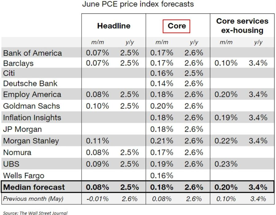 华尔街日报整理周五将要公布的美国6月核心PCE物价指数数据机构预期。