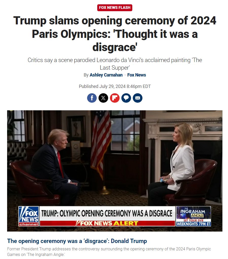 福克斯新闻:特朗普称巴黎奥运会开幕式“丢人现眼”(Disgrace)。“我很开明,但我认为他们做的事丢人现眼。”