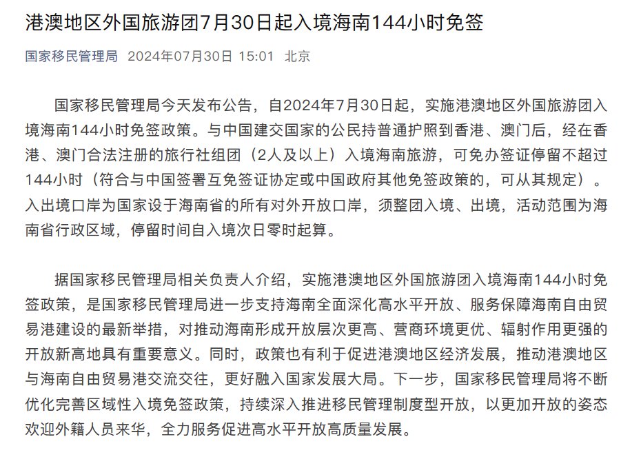国家移民管理局:7月30日起,实施港澳地区外国旅游团入境海南144小时免签政策。