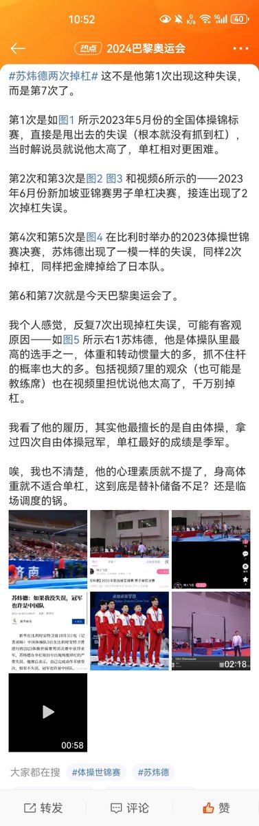 #观察 今天国内各大平台的讨论焦点集中在体操男团痛失金牌一事,因替补小将苏炜德出现两次掉杠重大失误后,曾一度大比分领先的中国队最终以0.6分之差负于日本队,获得银牌。