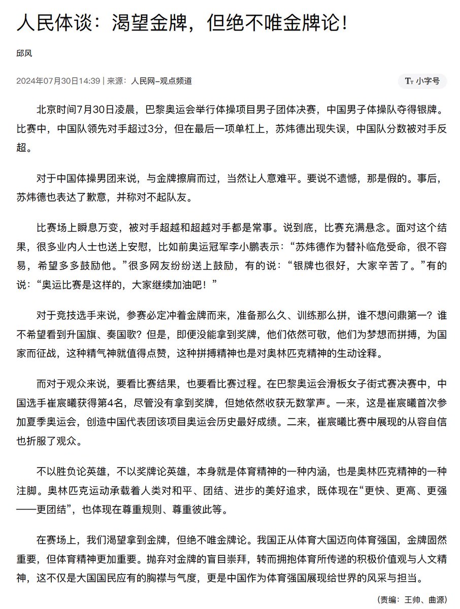 事后,人民网发布评论《渴望金牌,但绝不唯金牌论!》,指出要抛弃对金牌的盲目崇拜。
