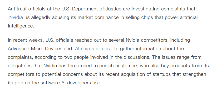 The Information:英伟达因竞争对手投诉面临美国司法部反垄断调查,调查人员正在调查英伟达是否对云服务提供商施加压力,要求其购买多种英伟达产品。
