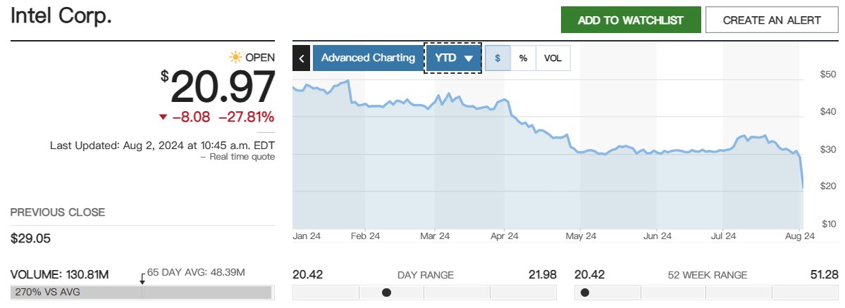 #行情 英特尔暴跌接近三成。未能赶上AI大潮,第二财季销售额令人失望,计划裁员1.5万人并暂停第四财季派息。 https://t.co/75Mt3HSea6