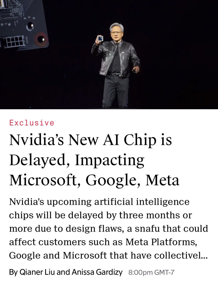 The Information:英伟达 $NVDA 的新款人工智能芯片因设计缺陷而推迟至少3个月发布,可能影响微软、谷歌和Meta等大客户。 https://t.co/aiOb2oQF3o