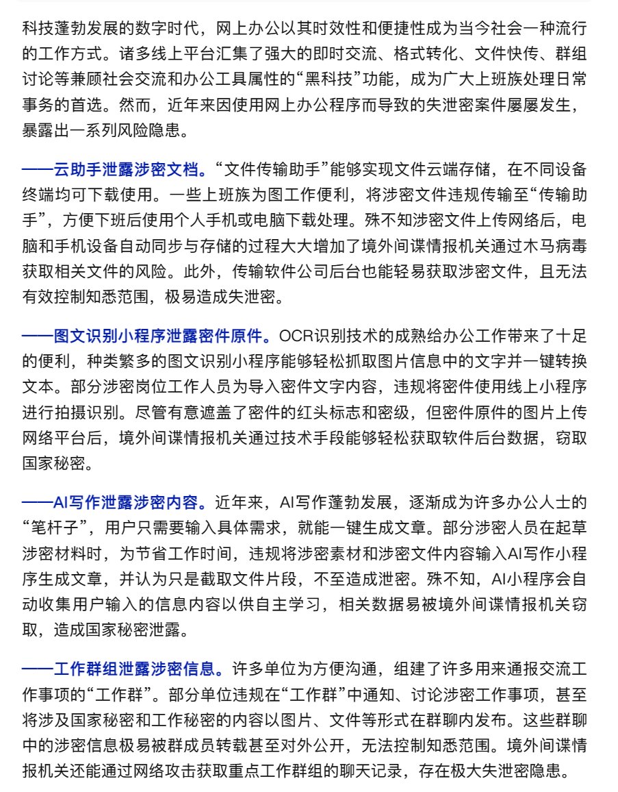 国家安全部微信公众号:“文件传输助手”增加了境外间谍情报机关通过木马病毒获取相关涉密文件的风险。此外,传输软件公司后台也能轻易获取涉密文件,且无法有效控制知悉范围,极易造成失泄密。