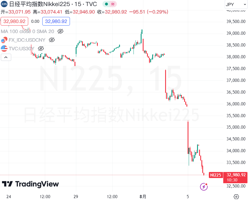 #行情 日股午后跌幅持续扩大,日经225指数跌超8%,失守33000点,完全回吐2024年以来涨幅。日经225指数期货触发熔断机制,交易暂停。
