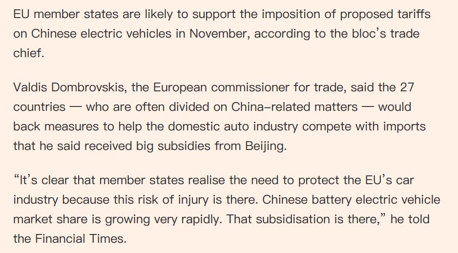 《金融时报》(FT)援引对欧盟贸易专员瓦尔季斯·东布罗夫斯基斯的采访报道,欧盟成员国可能支持11月对中国电动汽车加征关税的提议。他表示,成员国意识到保护欧盟汽车工业的必要性,因为“存在受到伤害的风险”