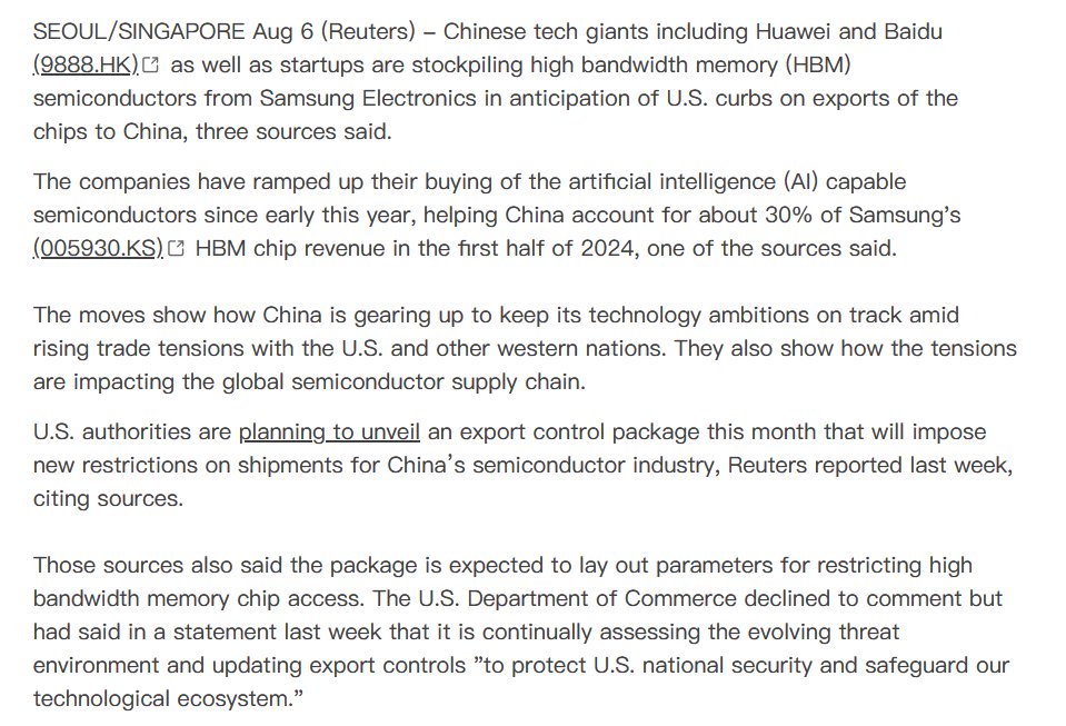 路透社:中企囤积三星HBM芯片,提防美国新限制措施