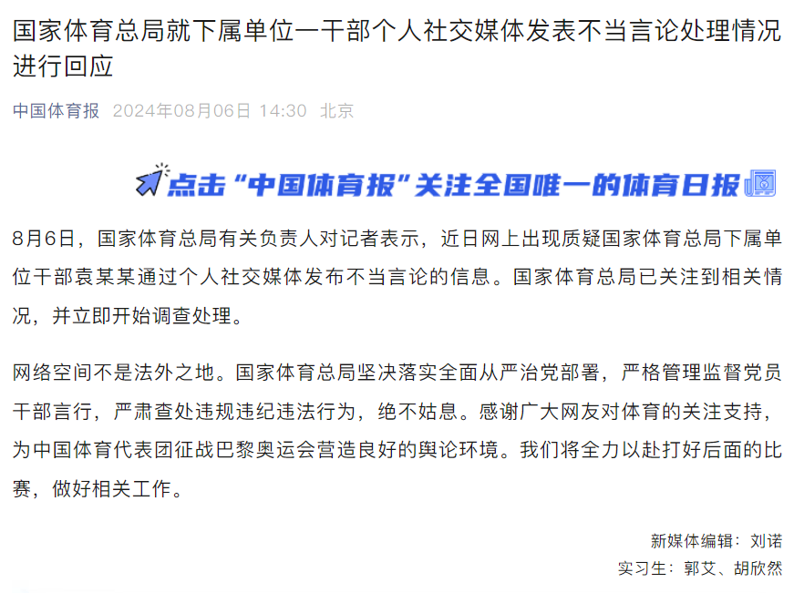 国家体育总局有关负责人表示,近日网上出现质疑国家体育总局下属单位干部袁某某通过个人社交媒体发布不当言论的信息。国家体育总局已关注到相关情况,并立即开始调查处理。 https://t.co/7Fcg9AouD3