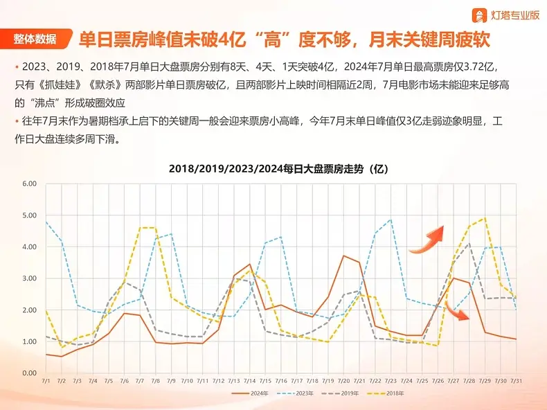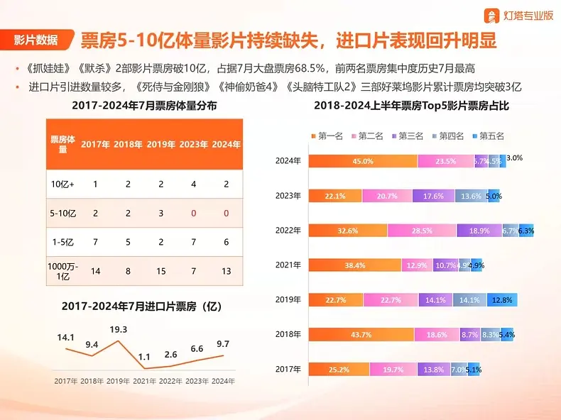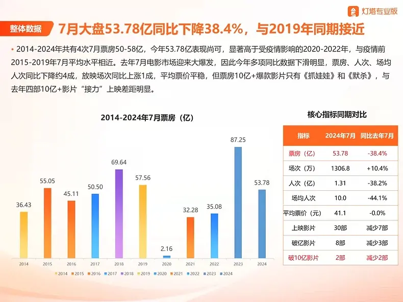 2024年前7个月全国累计票房293亿元,恢复至2019年同期79%。7月票房、人次、场均同比下降约四成,票房超过10亿元的只有《抓娃娃》与《默杀》。进口电影引进数量增加,但进口片票房恢复至2019的一半。