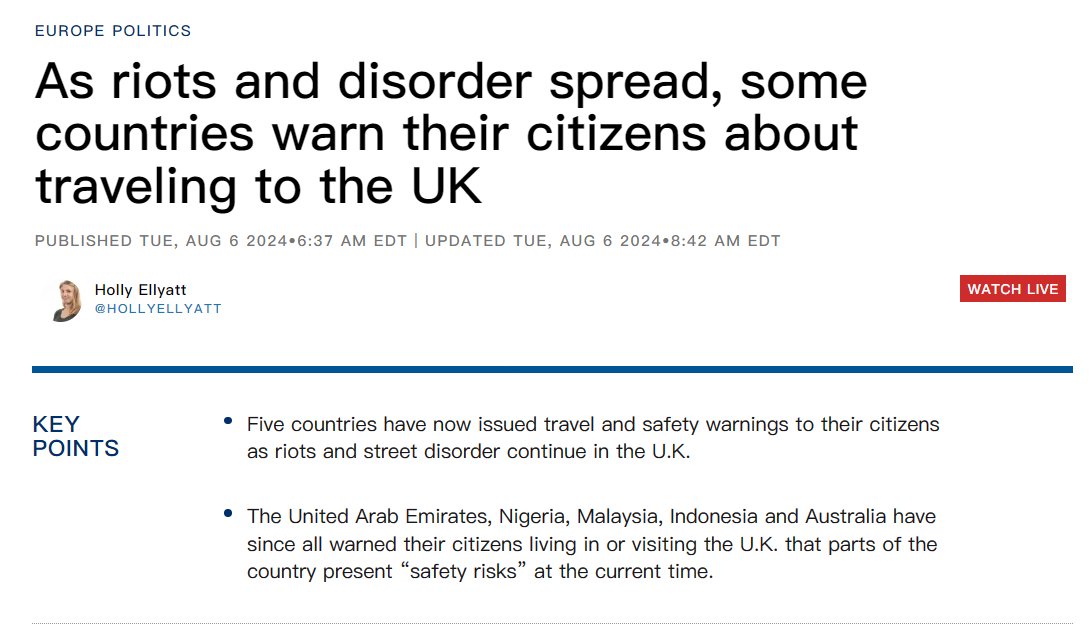 据CNBC报道,由于英国大规模骚乱仍在持续,许多国家已经向居住或访问英国的公民发布了旅行和安全警告。