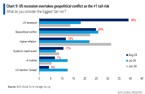 潜在风险因素排行中,“美国经济衰退”取代“地缘政治冲突”居首。