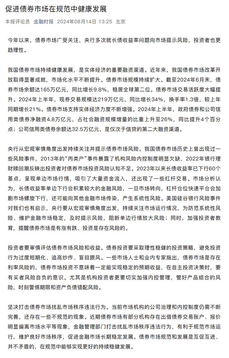 央行主管媒体《金融时报》发文称,当前市场机构的公司治理和内控制度存在一些不规范的现象,债券市场有部分机构存在出借债券交易账户、报价明显偏离市场水平等现象,金融管理部门打击扰乱市场秩序违法行为,有利于规范市场运行。债券市场规范和发展是互促互进、并不矛盾的。
