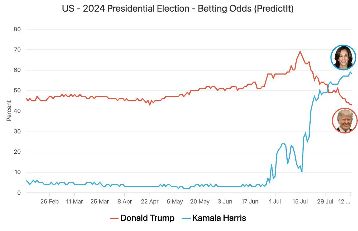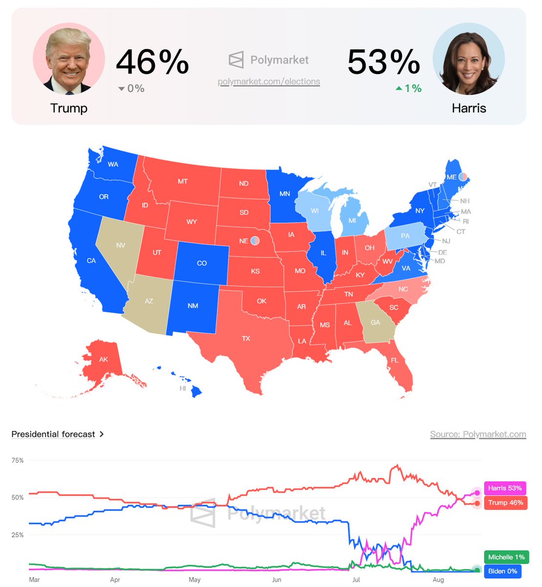 #观察 目前哈里斯在FiveThirtyEight、PredictIt与Polymarket预测平台上领先于特朗普。 https://t.co/HQGy6TR5R4