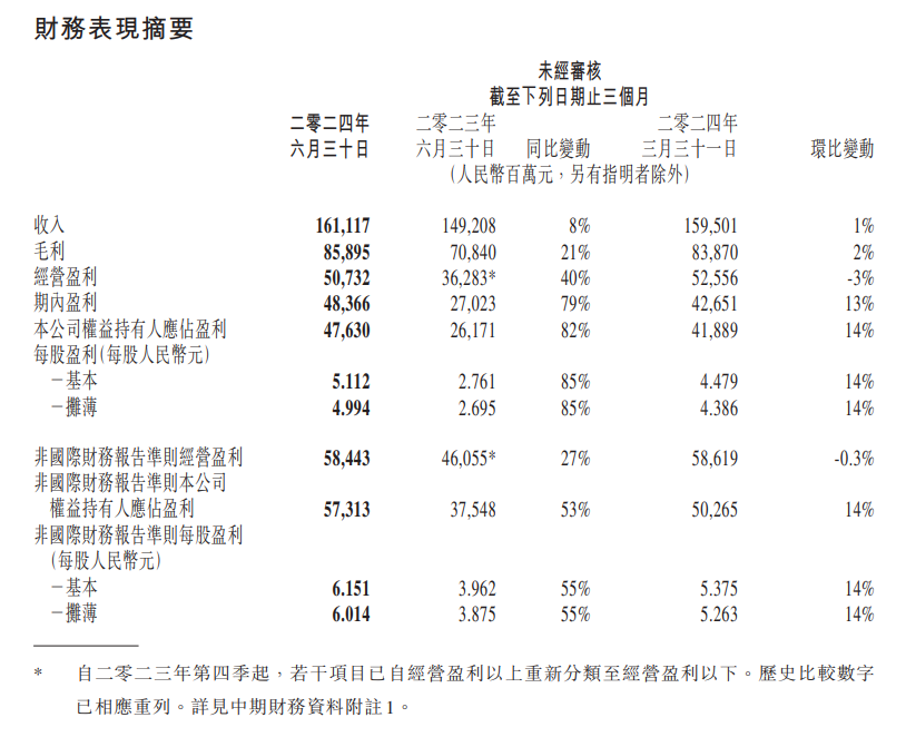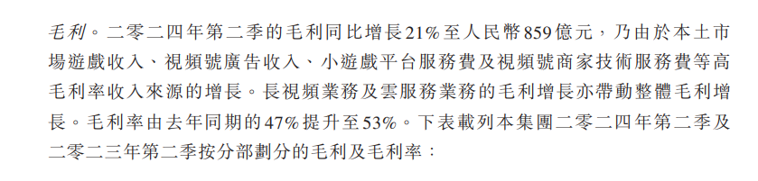 毛利859亿元人民币,同比增长21%;毛利率由去年同期的47%提升至53%。