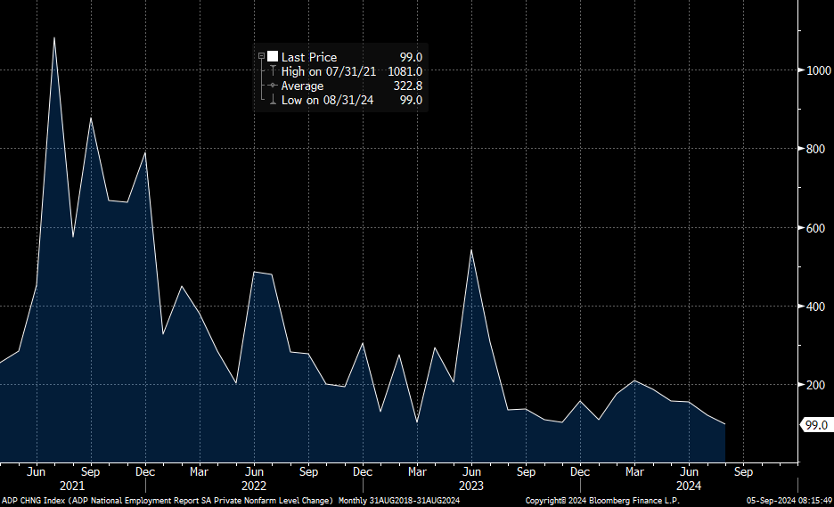 美国8月ADP就业人数9.9万人,低于14.5万人的预期,创2021年1月以来最低单月增幅;前值由12.2万人下修至11.1万人。ADP报告指,美国8月劳动力市场继续降温,私营部门就业增长连续第五个月放缓。