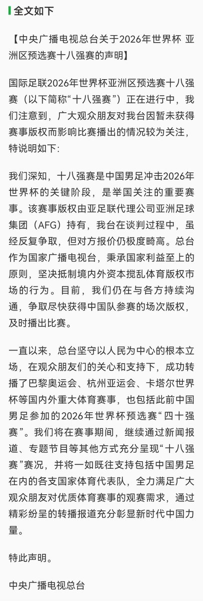 央视特地对不转播赛事作出解释,但随后删除公告。